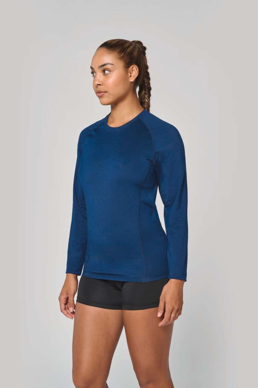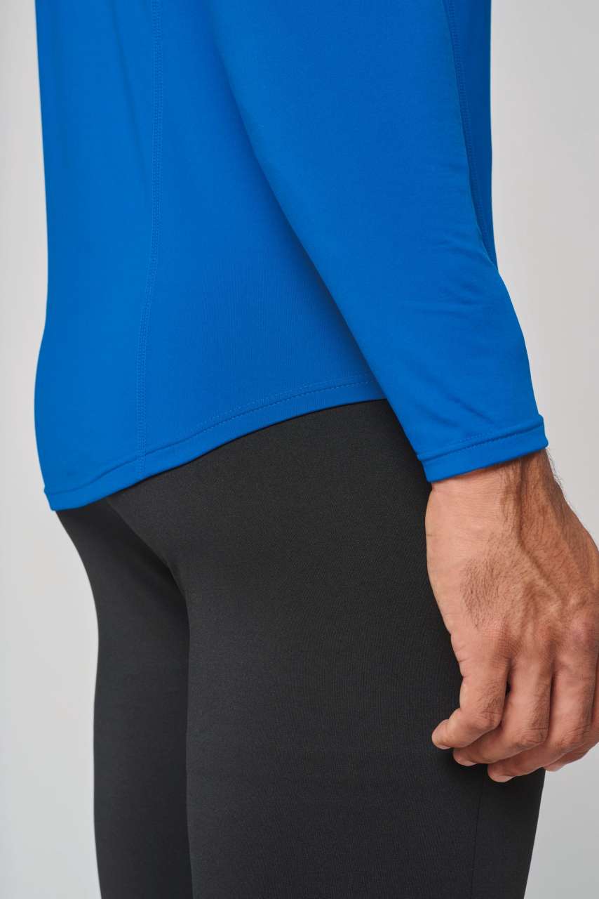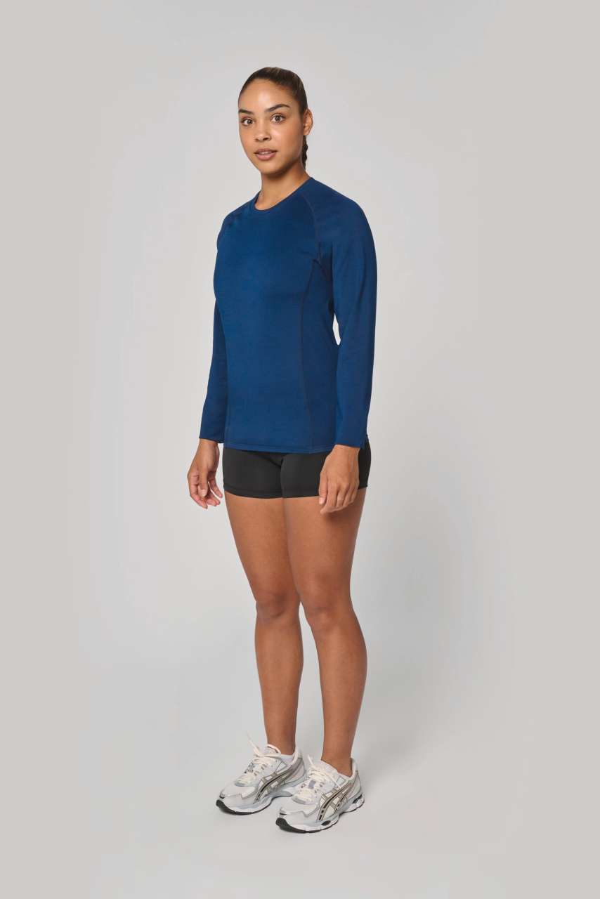 88% polyester / 12% elastane Crew neck Matching cover stitch Twin needle finishing at the cuffs and hem