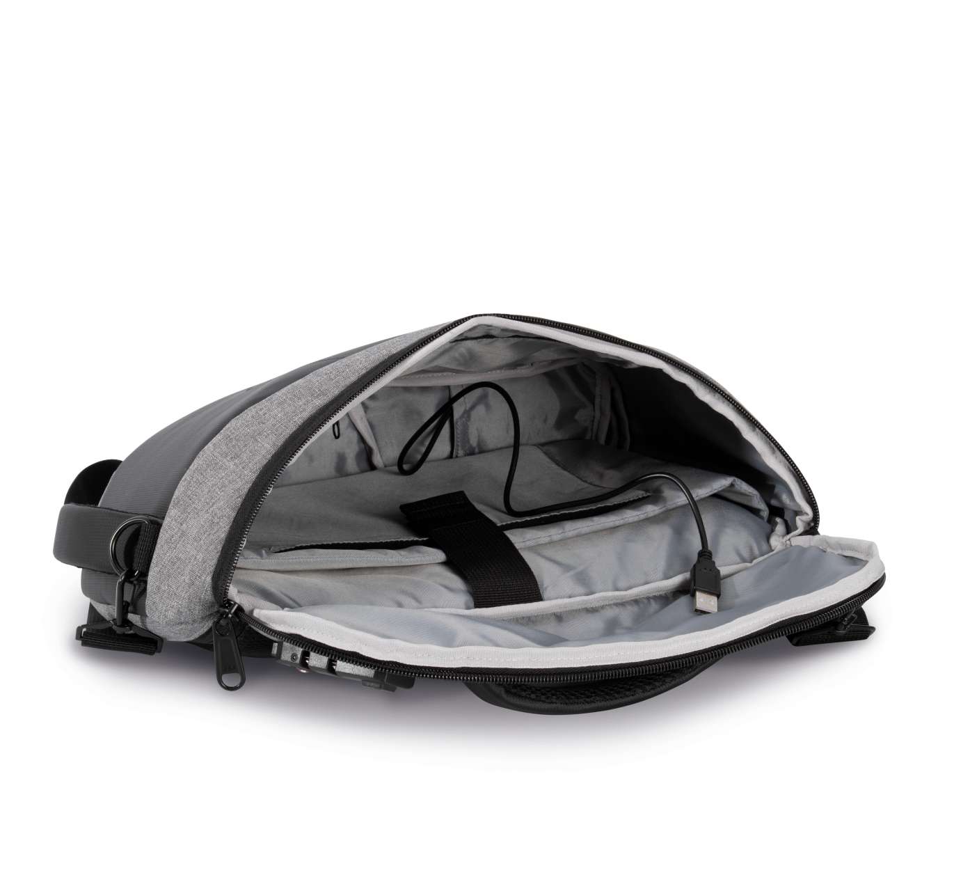 1side pocket with integrated USB port and inner micro-USB cable (supplied) for connecting to a powerbank