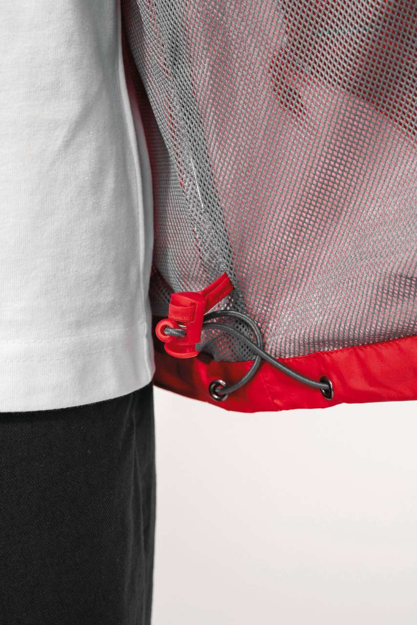 100% 210 T polyamide with acrylic coating Polyester tricot and mesh lining Concealed hood Zip through front 2 front pockets with contrast bartacks 1 inside pocket Elasticated drawcord with toggles at hem Zip access for decoration