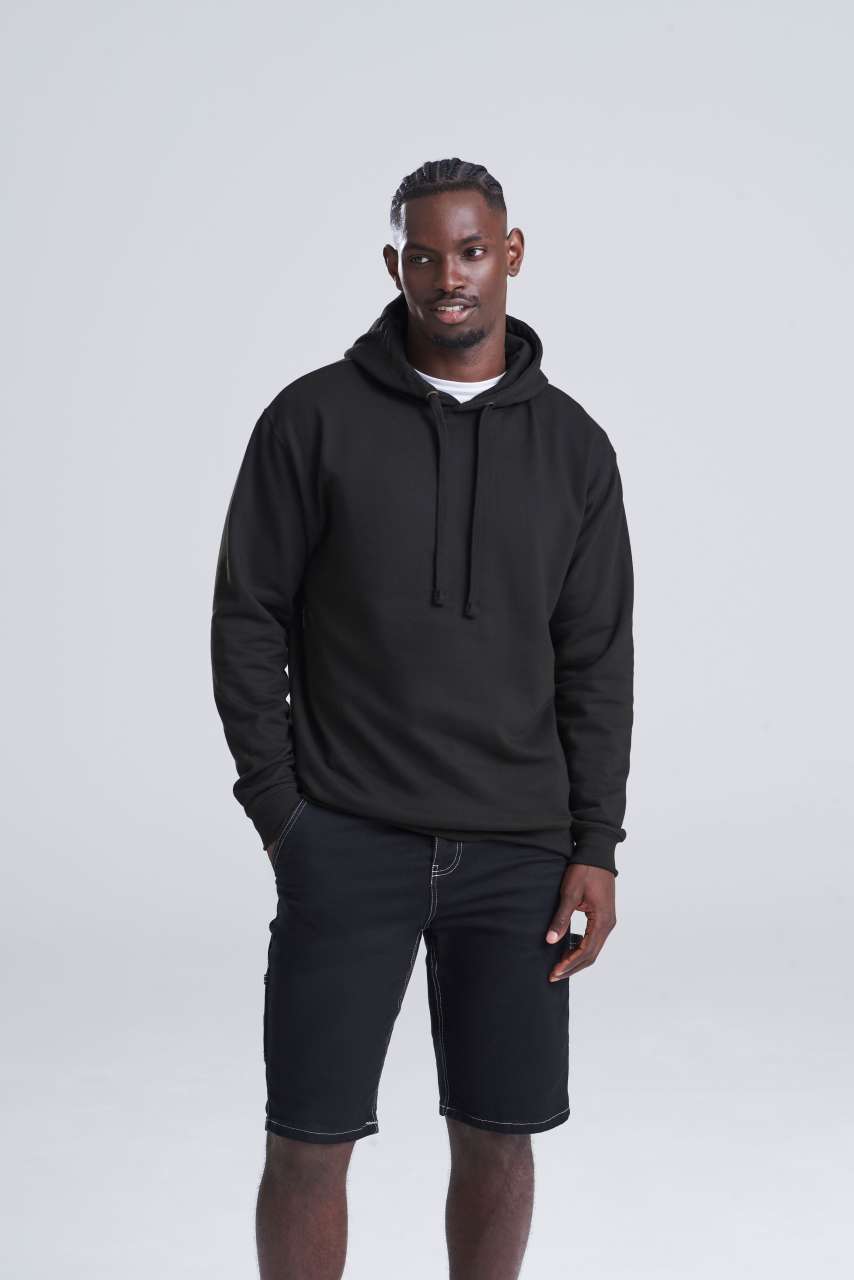 80% Ringspun Cotton/20% Polyester Relaxed fit Double fabric hood Flat lace drawcords No pocket for maximum print surface area Brushed inner fleece Ribbed cuffs and hem Twin needle stitching detail Tear away label 100% cotton faced fabric