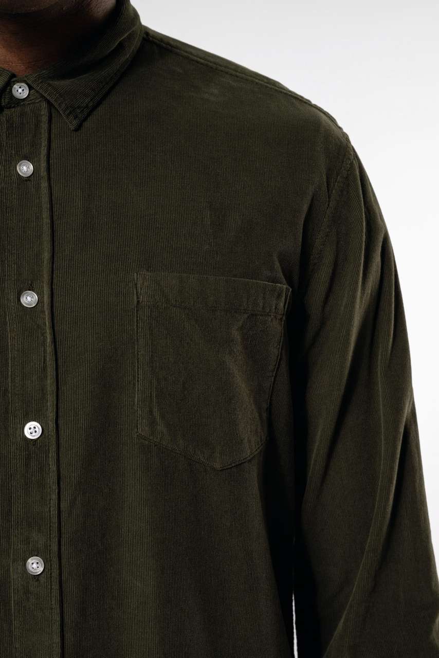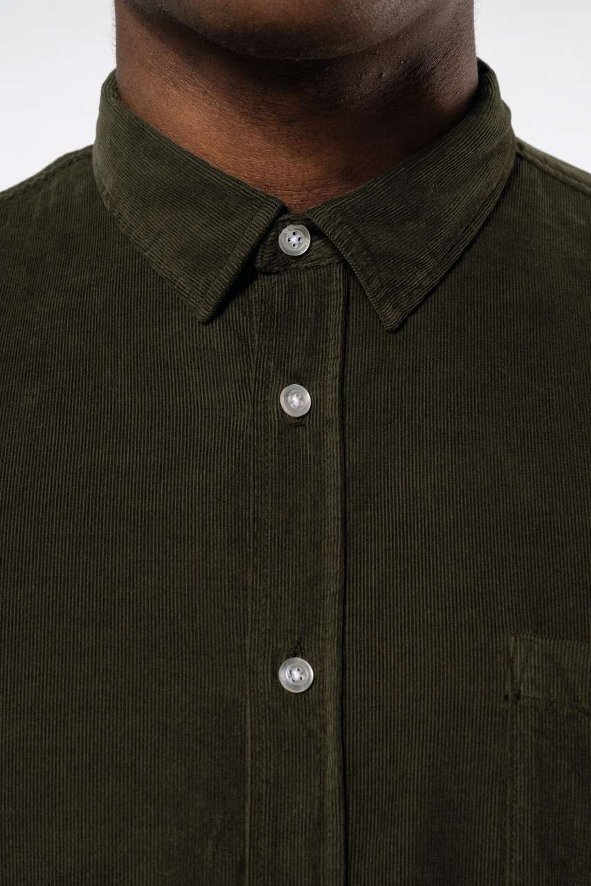 Adjustable cuffs with two buttons and rounded corners, and a pointed tab end with pearlised button