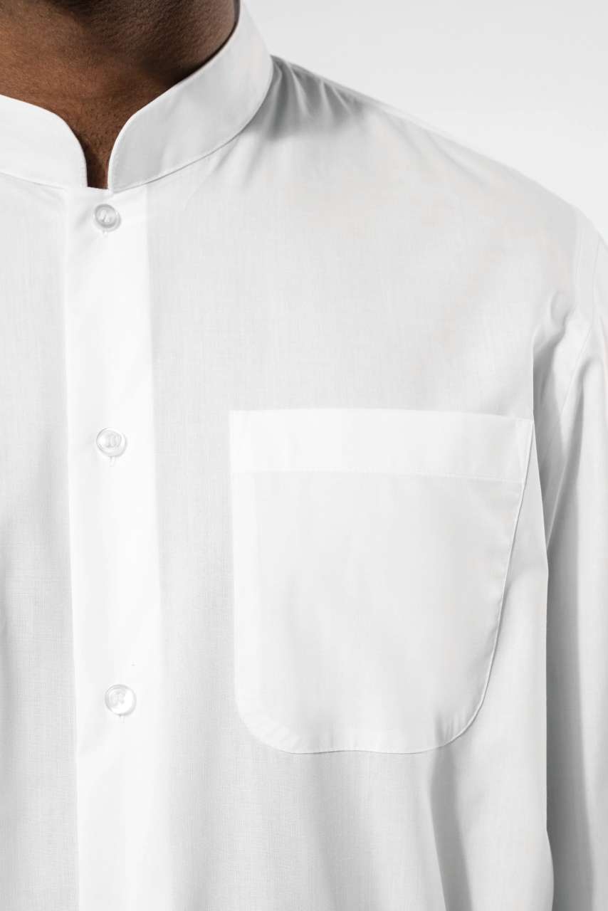 65% polyester/35% cotton poplin Easy-care fabric Mandarin collar Matching buttons Rounded left chest pocket Adjustable rounded cuffs with button placket 2 spare buttons Certified STANDARD 100 by OEKO-TEX®N° CQ1007/8. IFTH