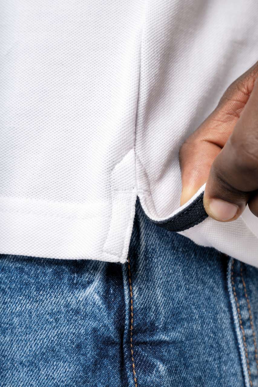 Ribbed collar with contrast tipping and contrast undercollar (except White/ Navy: no contrast under the collar. only a thin red border under the placket)