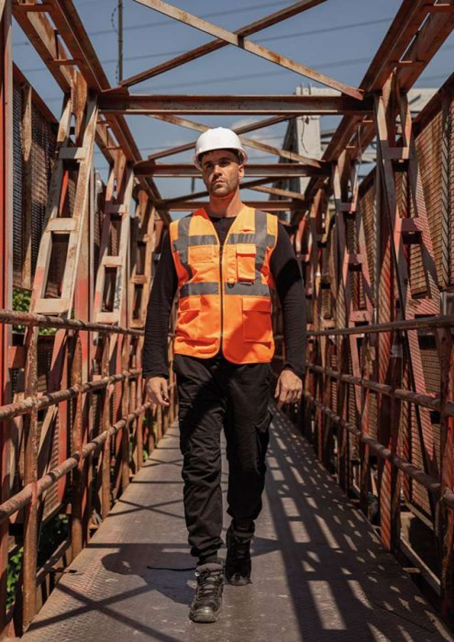 Multifunctional safety vest with a 5cm wide reflective stripe around the body. over the shoulders and over the chest