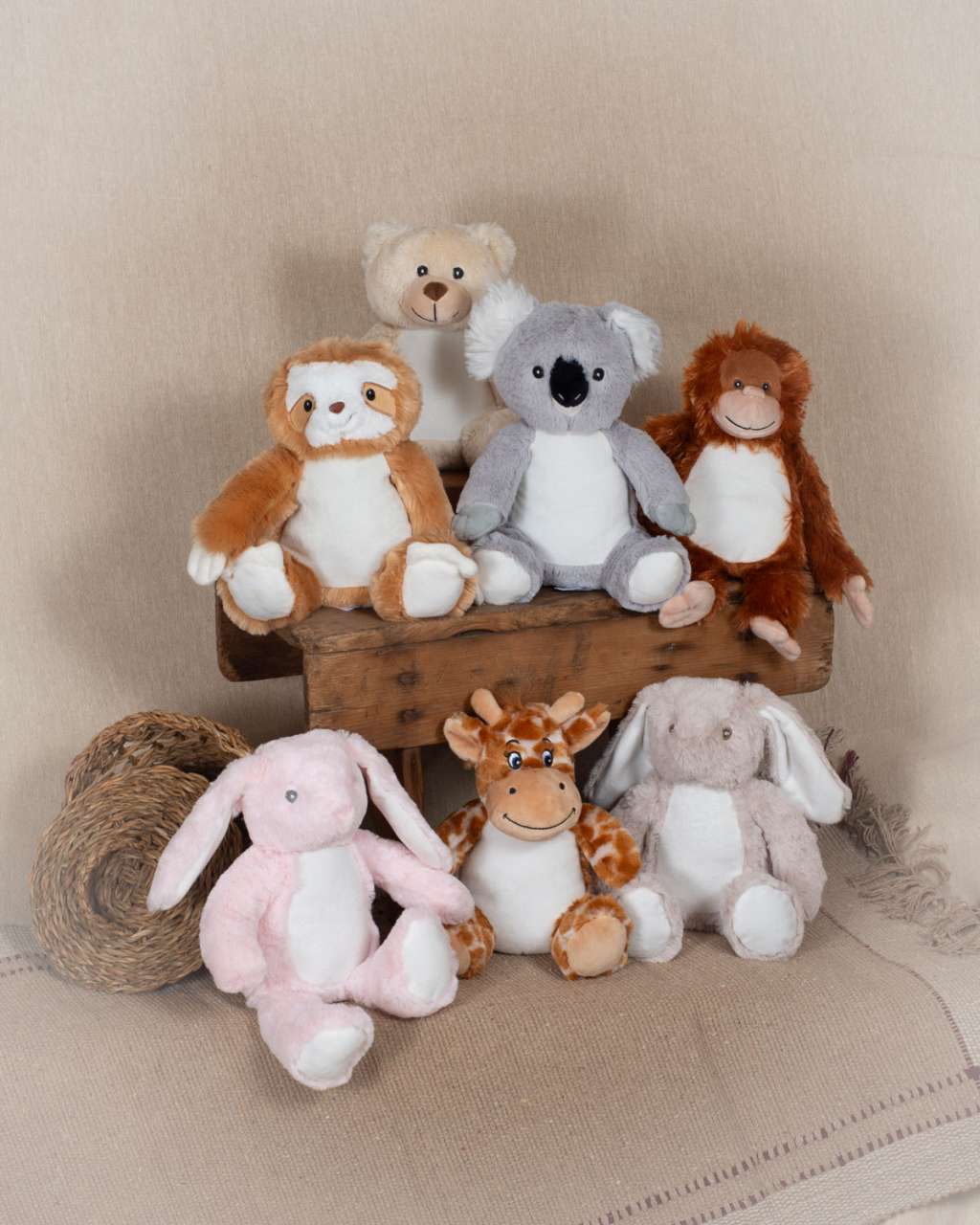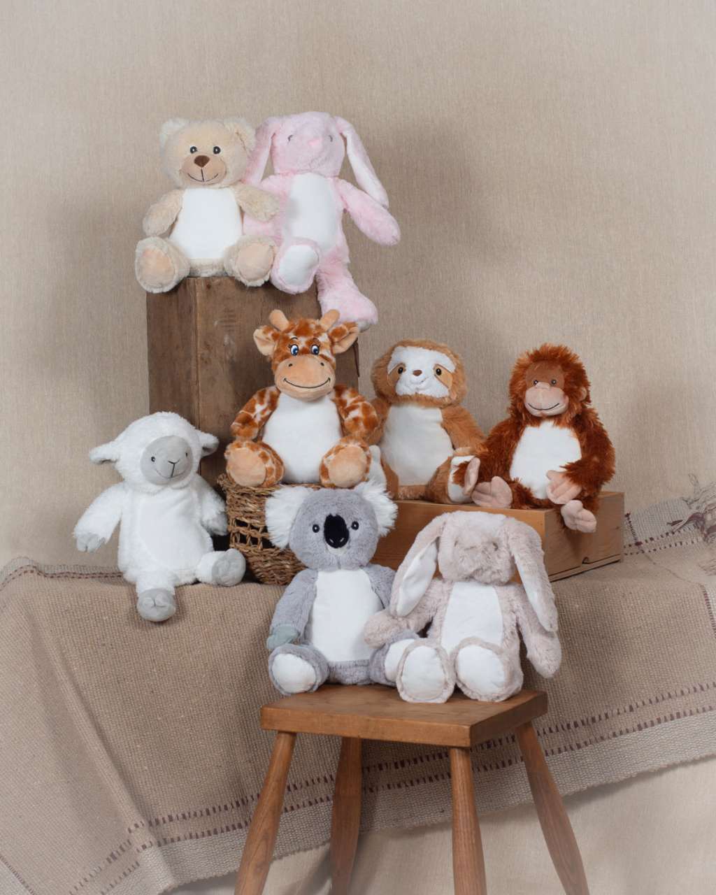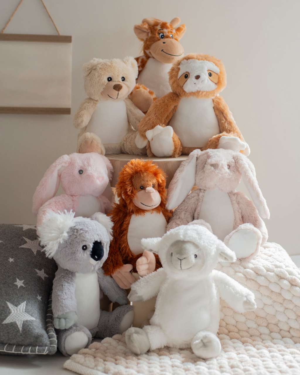 Black and White Cow, Bunny Blue, Bunny Grey, Bunny Pink, Bunny White, Cat, Dog, Dragon, Elephant, Giraffe, Highland Cow, Kangaroo, Koala, Lamb, Lion, Orangutan, Owl, Penguin, Rainbow Bear, Reindeer, Sloth, Teddy Blue, Teddy Light Brown, Teddy Pink, Teddy White, Unicorn