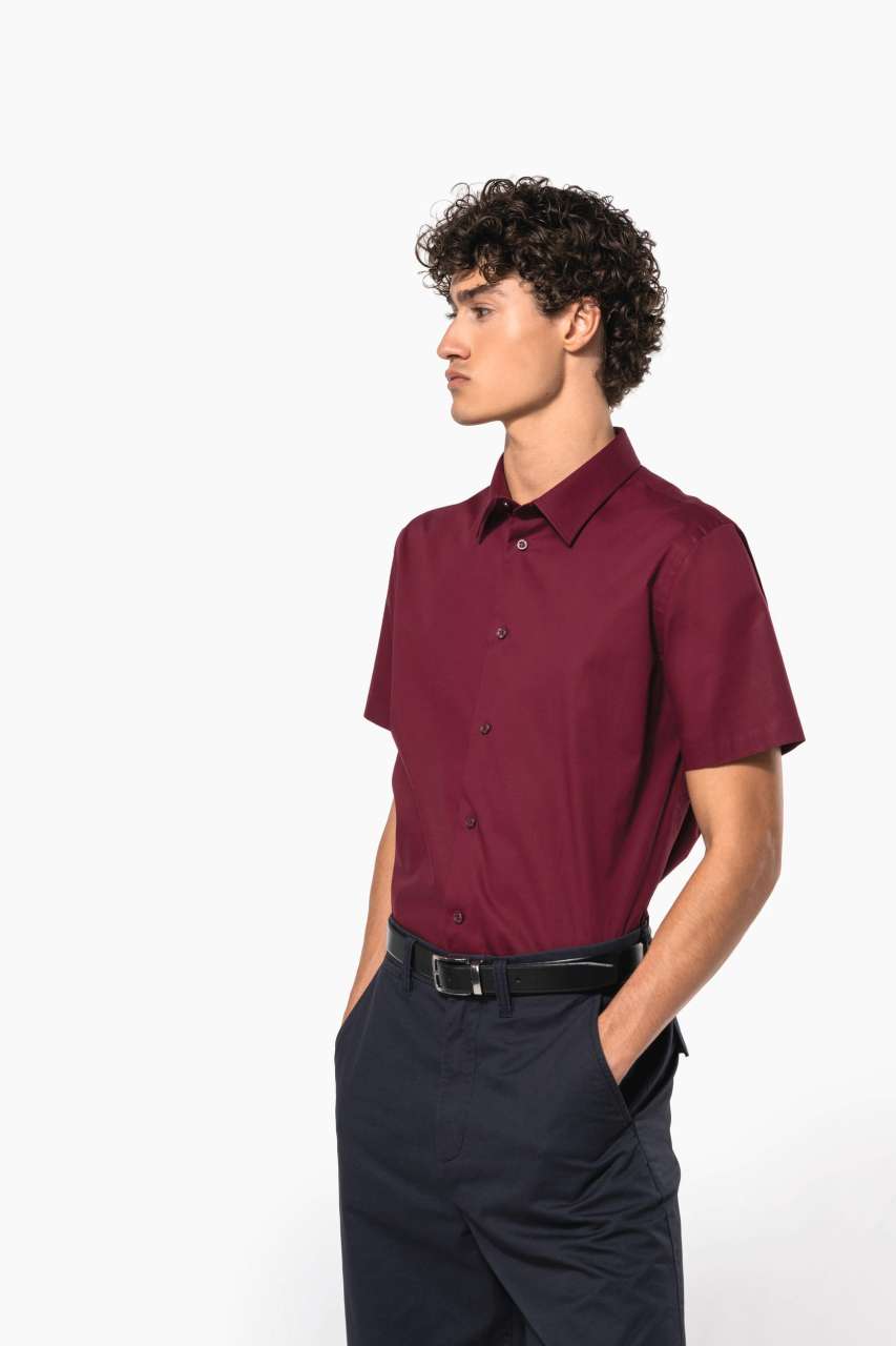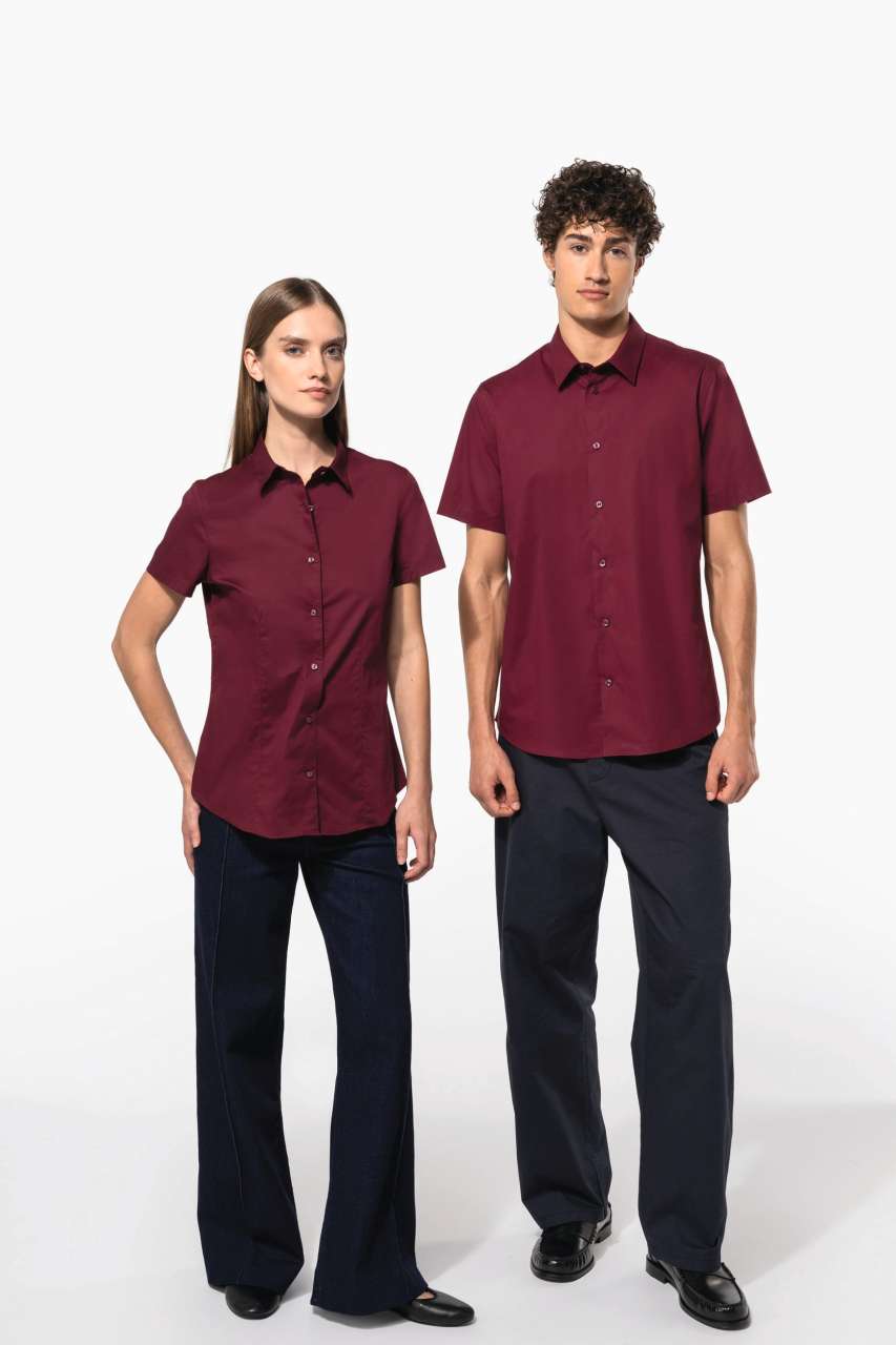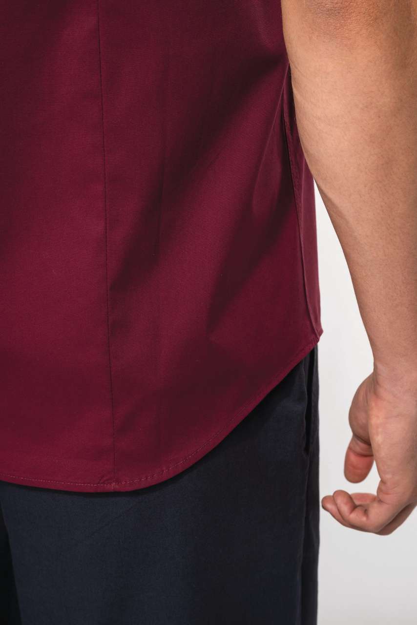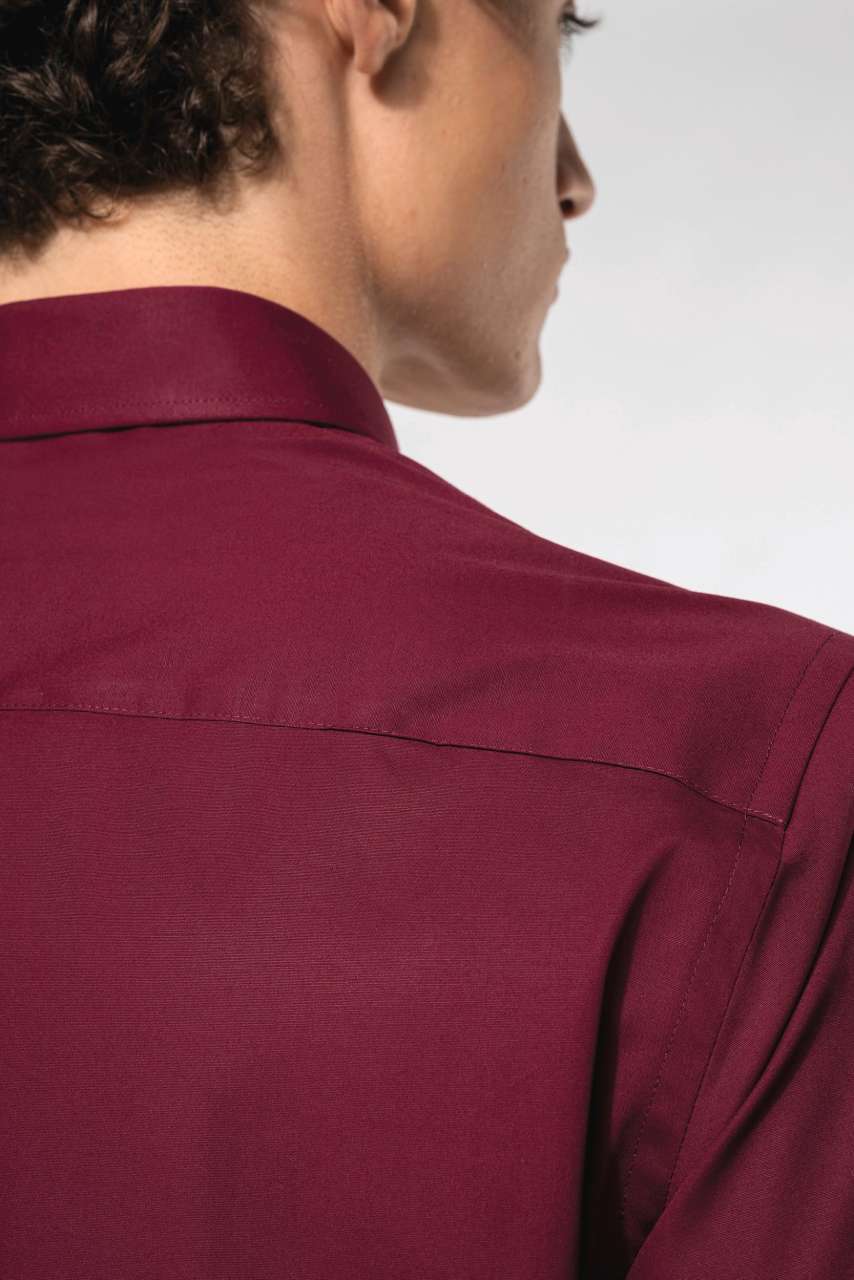 97% cotton/3% elastane Elastane for fitted style and extra comfort Cut-away boned collar Matching buttons Double back yoke and darts Felled seams 1 spare button Shaped hem Certified STANDARD 100 by OEKO-TEX® N° CQ 1007/8. IFTH