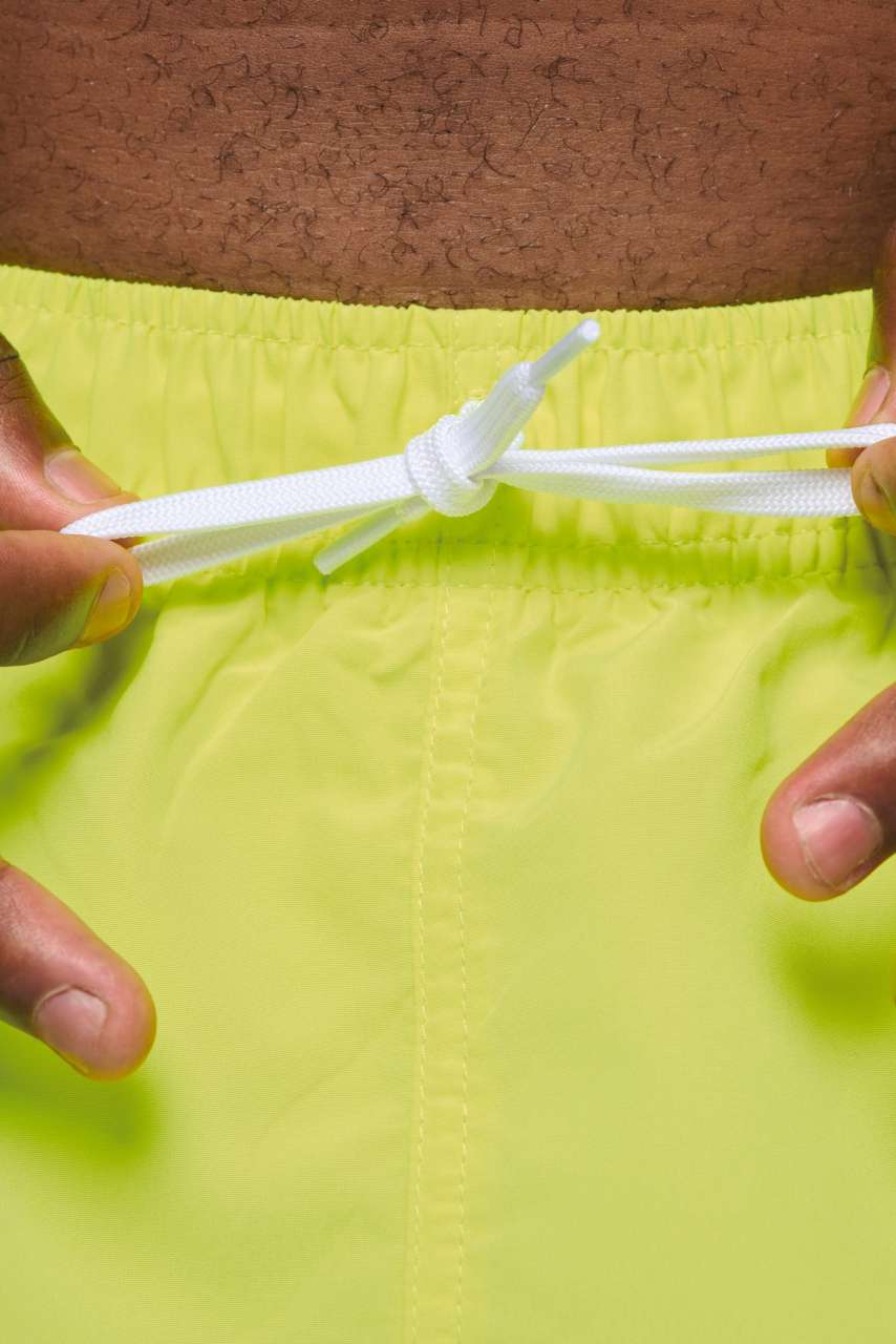 100% polyester Peached soft touch Elasticated waistband with contrasting drawstring Integrated mesh knit briefs 1 back patch pocket with tear release fastening
