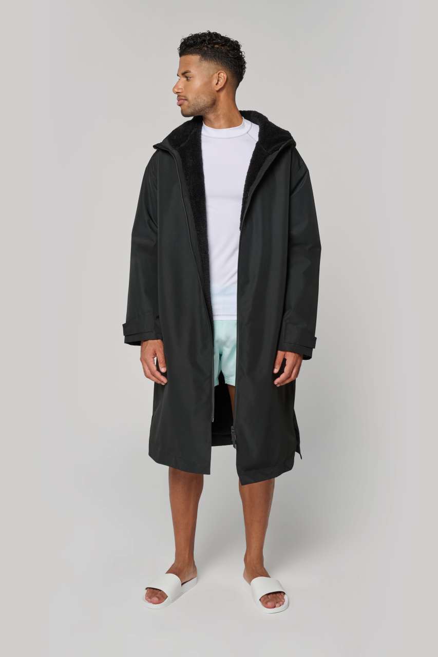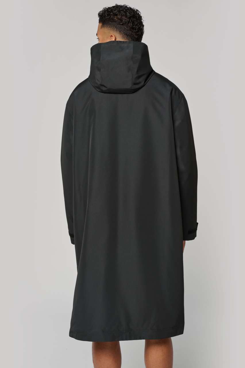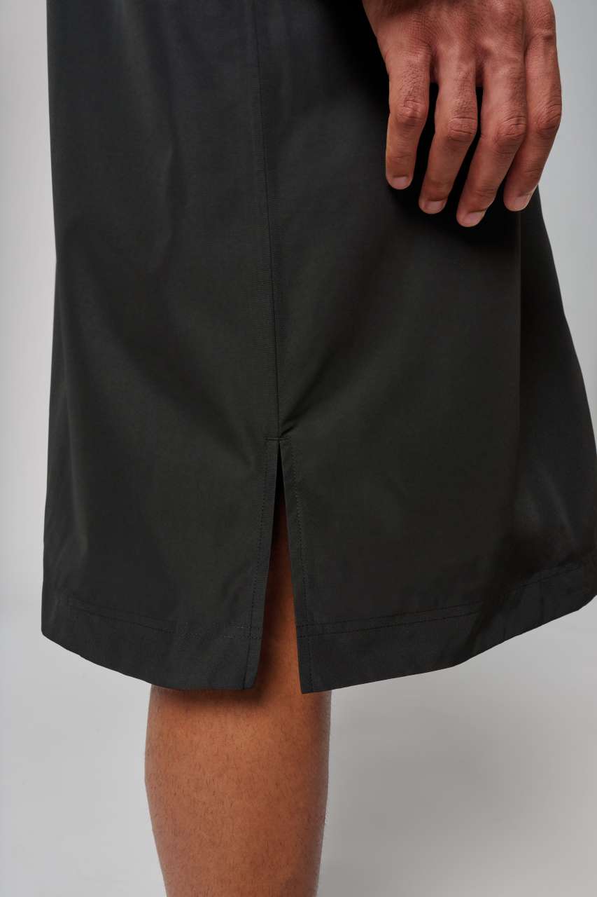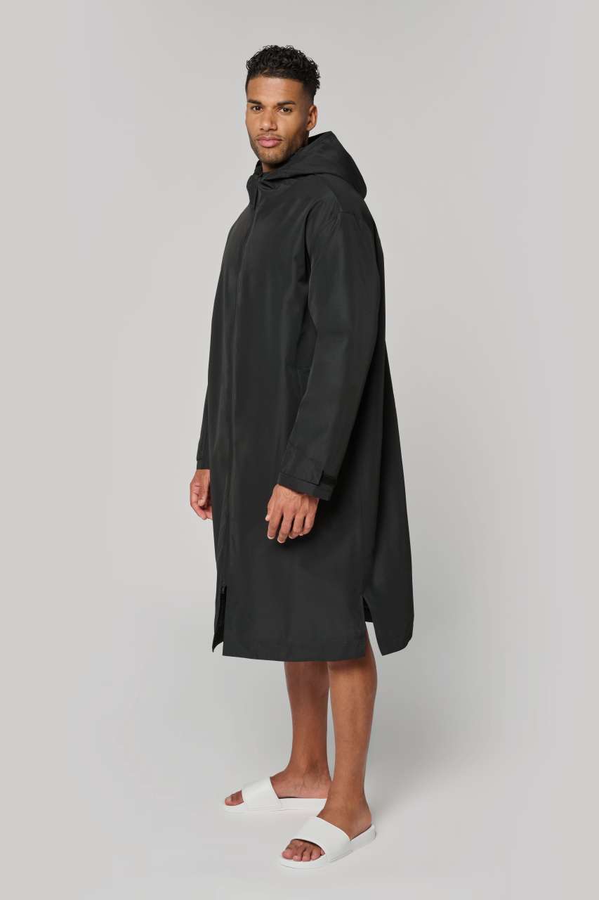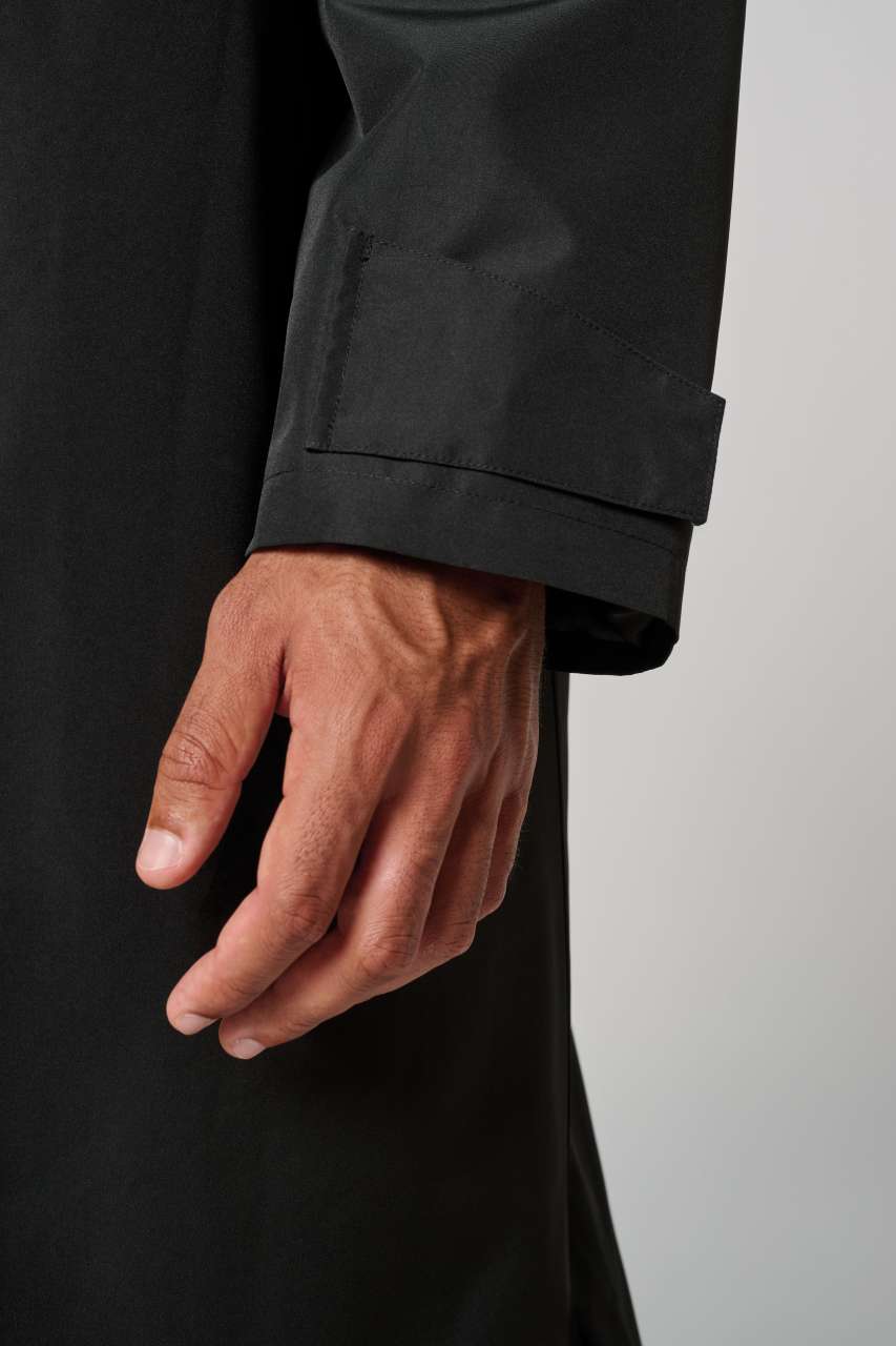 Long waterproof parka with slits at the bottom