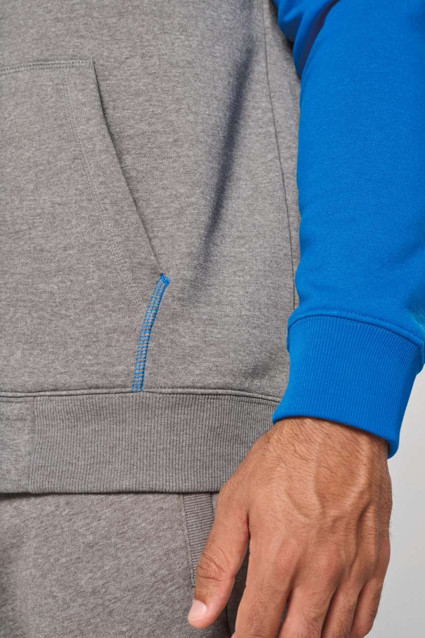 65% polyester / 35% cotton Brushed fleece Zip fastening Contrasting raglan sleeves and hood Hood lined in matching mesh knit Kangaroo pockets with fluorescent phone pocket Earphone access 2 x 2 double layer ribbed cuffs and hem